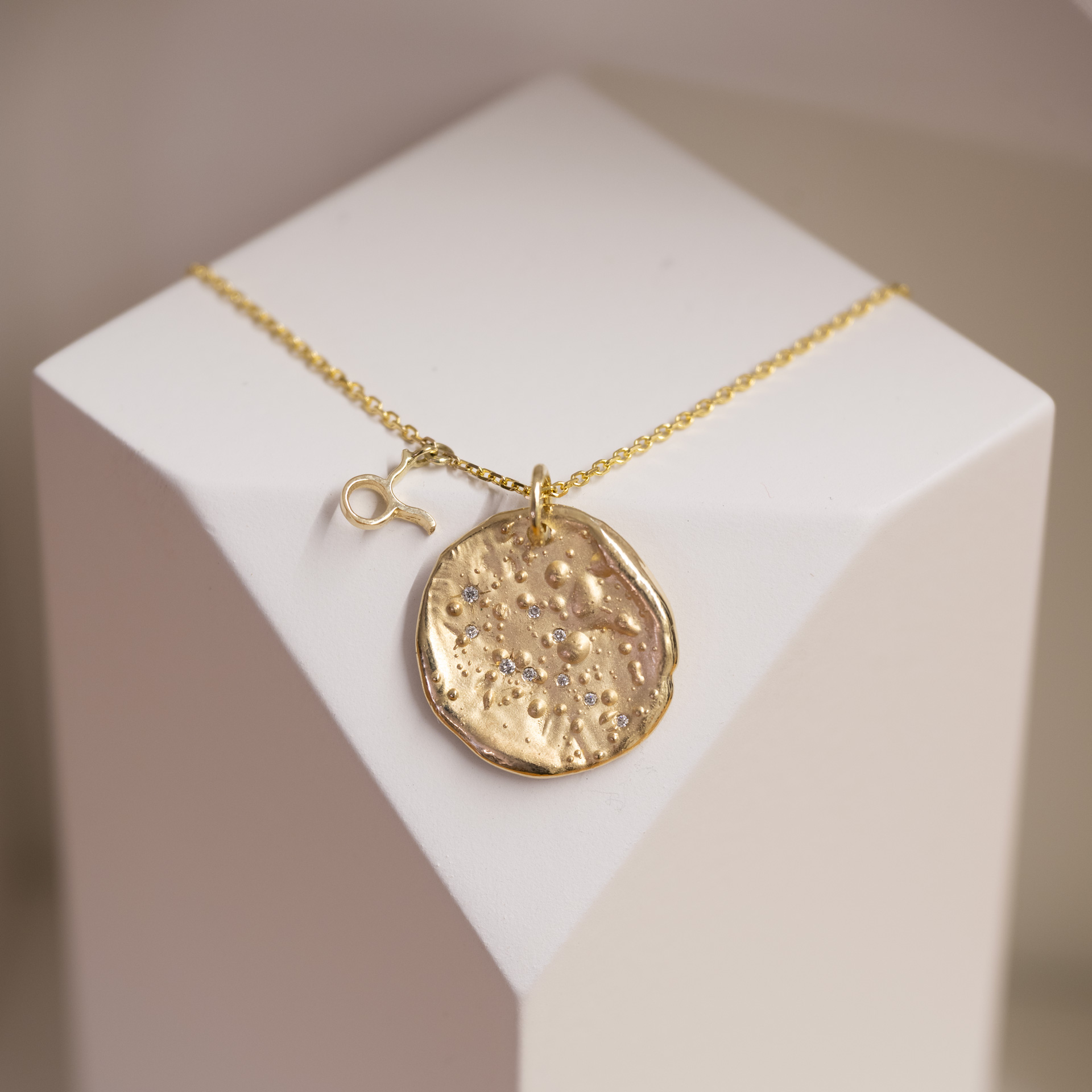 A 14 karátos sárga arany csillagkép medálok az égbolt időtlen szépségét és a bennünk rejlő erőt ünneplik. Minden medál felületén az adott csillagjegy