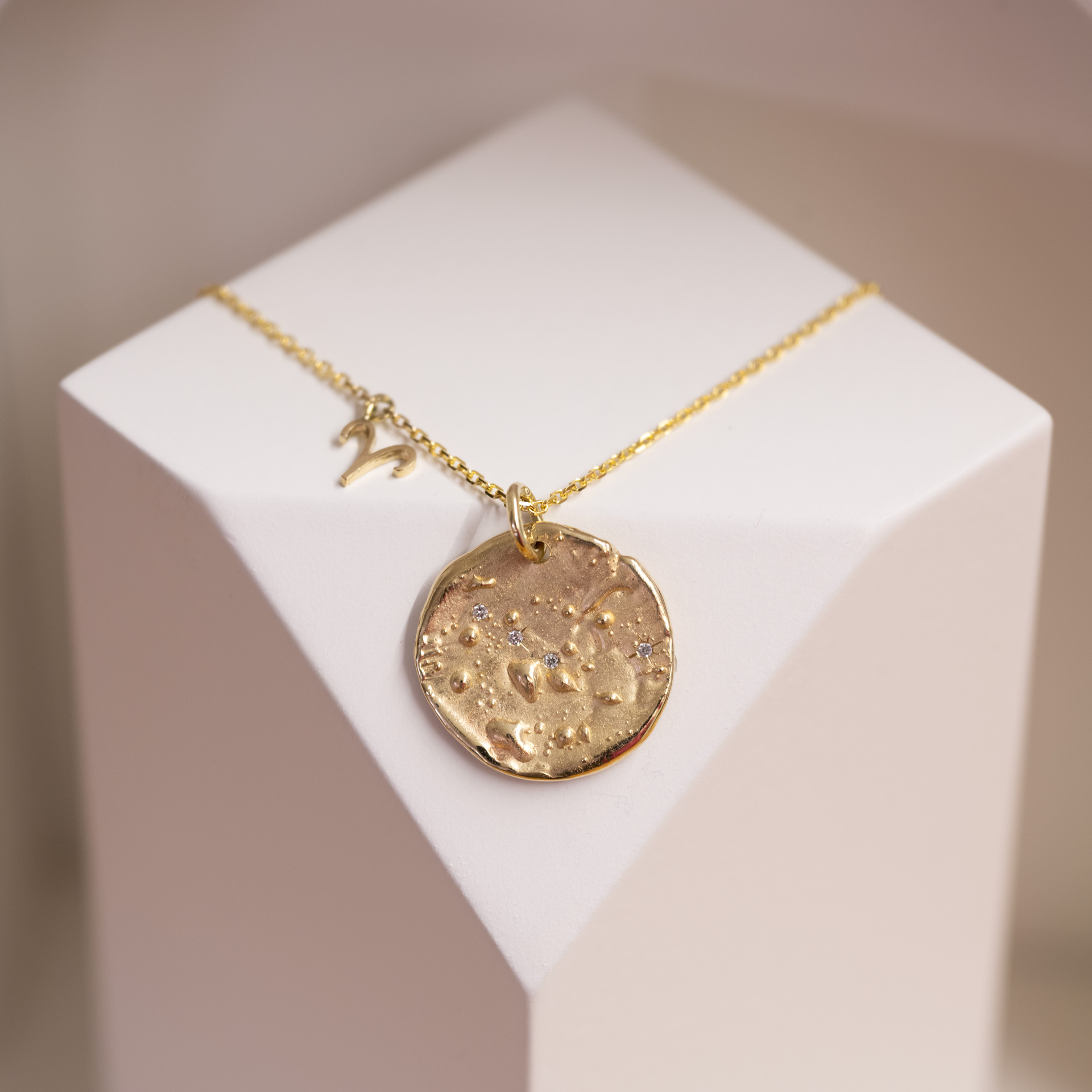 A 14 karátos sárga arany csillagkép medálok az égbolt időtlen szépségét és a bennünk rejlő erőt ünneplik. Minden medál felületén az adott csillagjegy